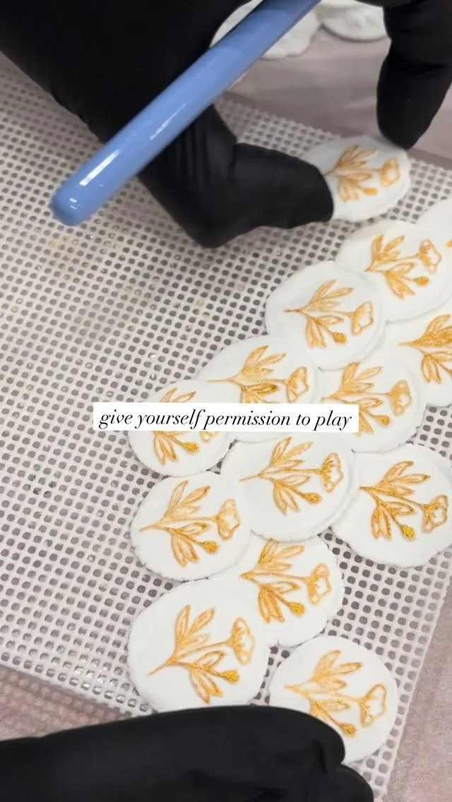 Ten hexagon cookies painted with one cohesive design. Learn more…